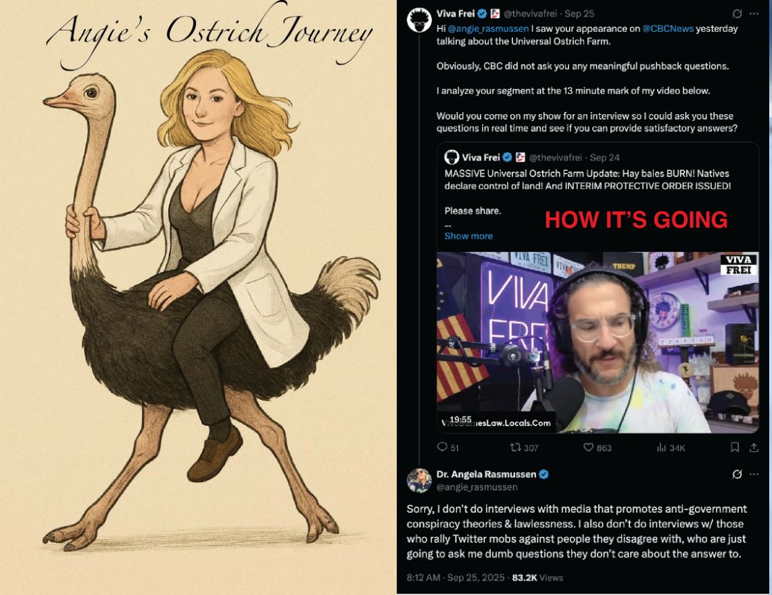 Dissection of Dr. Angela Rasmussen’s hit piece on Universal Ostrich Farms. She fully supports the official CFIA narrative without scientific evidence. Her snide, ridiculing remarks are inappropriate for a professional article. Can you say misinformation, disinformation, deception, propaganda, LIES?